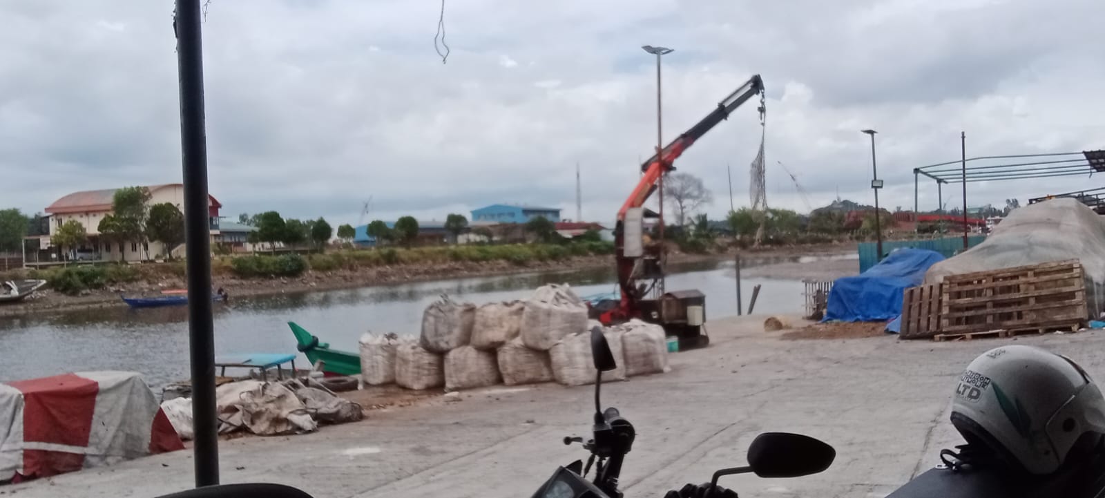 Pantauan di lokasi pada Rabu, 11 Februari 2026 sekitar pukul 12.44 WIB, terlihat alat berat crane mengangkat karung-karung dari daratan menuju kapal kayu kecil di bibir laut. Kegiatan berlangsung terbuka tanpa papan plang perusahaan maupun identitas usaha.