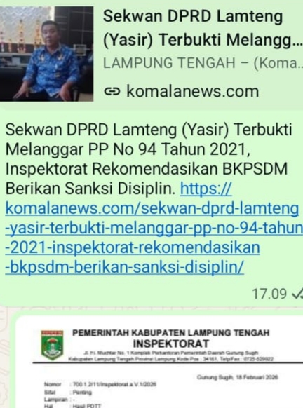 Tanpa tedeng aling-aling, Inspektorat secara resmi merekomendasikan kepada Kepala BKPSDM untuk menjatuhkan hukuman disiplin kepada YA, pejabat yang menjabat sebagai Sekretaris DPRD Kabupaten Lampung Tengah. Ini bukan dugaan liar. Ini hasil pemeriksaan. Ini fakta administratif. Ini pelanggaran yang harus dibayar dengan sanksi.